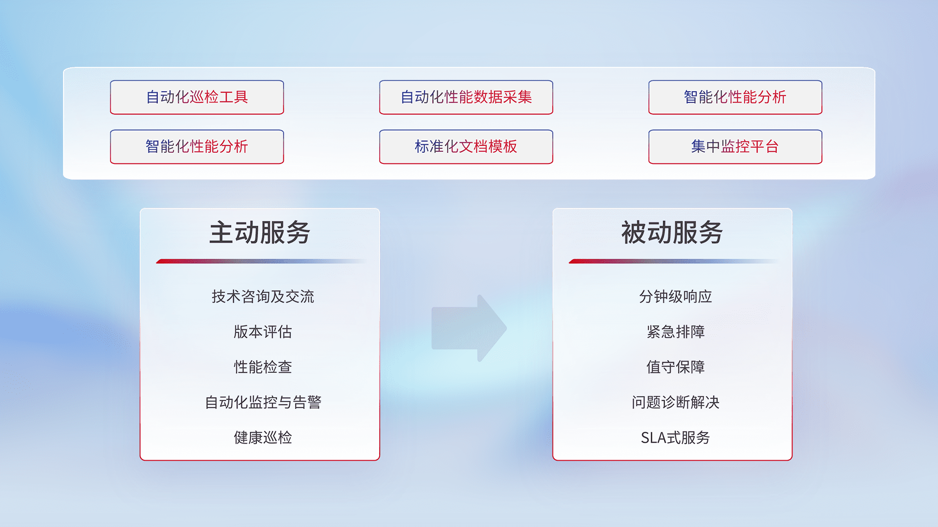 智能化工具和标准化文档,,,,保障服务质量,,,,提供主动服务(包含技术咨询、、、版本评估、、、、性能检查、、、自动化监控与告警、、健康巡检)和被动服务包含(分钟级响应、、、、紧急排障、、、、值守保障、、、、问题诊断解决、、、、SLA服务)。。。